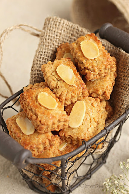 - Roll out the dough & cut into preferred shapes using a cookie cutter. Arrange in baking tray (I lined with baking paper), egg wash & place sliced almonds on top. Bake biscuits in oven at 160 deg C for 8-10 minutes or until crispy.